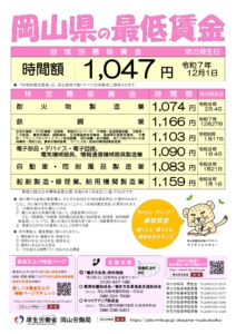 岡山県最低賃金が令和7年12月1日から【時給額1,047円】に改定されています。特定最低賃金も令和8年より改定されています。